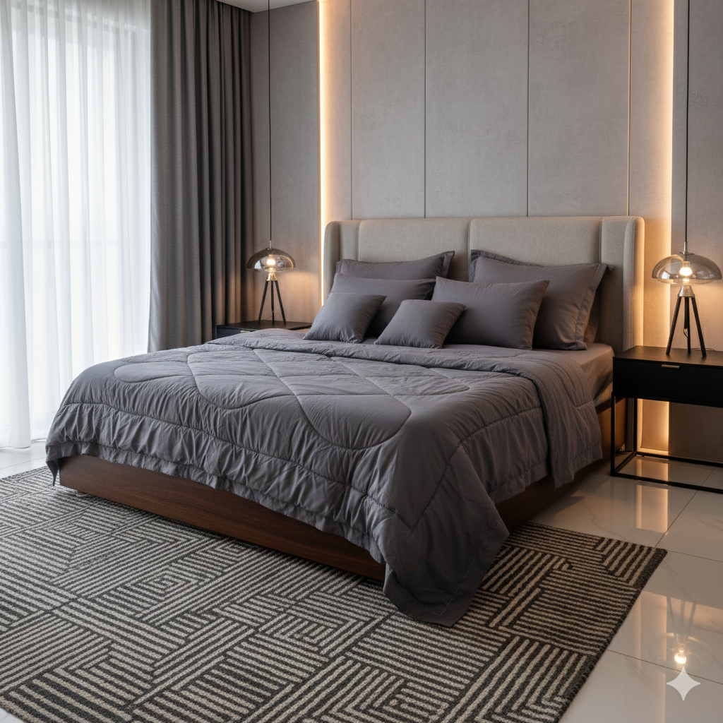 طقم لحاف مايكروفايبر صيني سادة عالي الجودة يتكون من 10 قطع متنوعة مملوئة بحشوة المايكروفايبر الناعم, تشمل لحاف وخداديات وملاءات بتصميمات وألوان جذابة, مصنوع من ألياف المايكروفايبر الفاخرة التي توفر ملمسا ناعما, مناسب لجميع المواسم ومثالي لغرف النوم العصرية